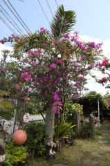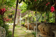 ブーゲンビリアやパッションフルーツの木々に囲まれ、入り口には大きな石がお出迎え。